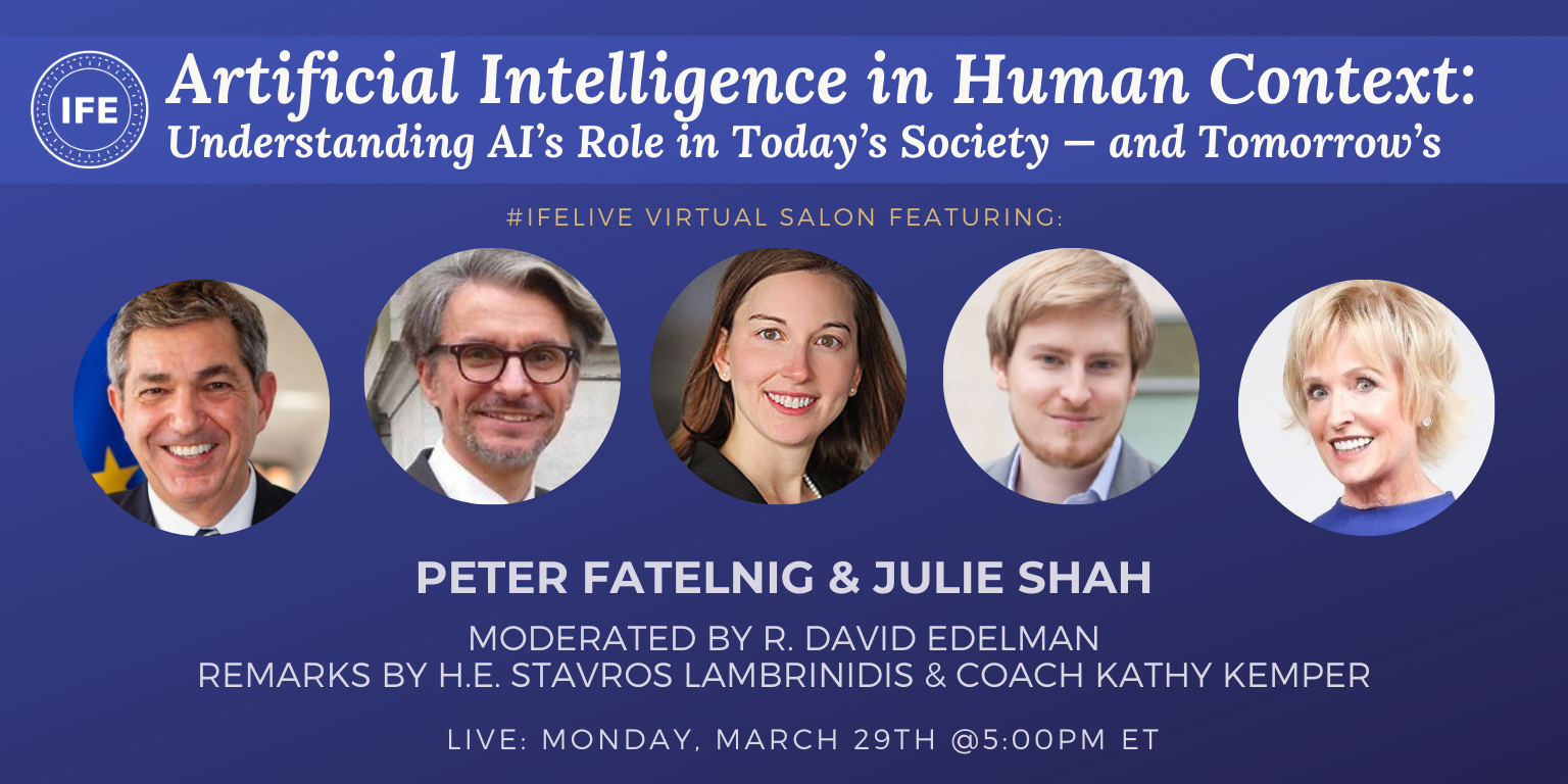The Institute for Education’s Coach Kemper co-hosted a live salon on Artificial Intelligence in Human Context: Understanding AI’s Role in Today’s Society — and Tomorrow’s with IFE Diplomatic Steward of Artificial Intelligence H.E. Stavros Lambrinidis as part of its #IFElive virtual series. Featured speakers included Julie Shah, Associate Professor in the Department of Aeronautics and Astronautics at MIT and leads the Interactive Robotics Group of the Computer Science and Artificial Intelligence Laboratory, and Peter Fatelnig, Minister-Counsellor for Digital Economy Policy at EU Delegation to the US. IFE Steward Dr. R. David Edelman, who currently directs the Project on Technology, the Economy, and National Security at the Massachusetts Institute of Technology, moderated the session.